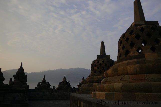 By the time I reached the top of Borobudur, dawn had broken through the clouds — I wondered why ticket office handed me a flashlight when it was light enough at that hour to see my way (I needed more signs pointing in the right direction for the entrance as I was still rather bleary-eyed).