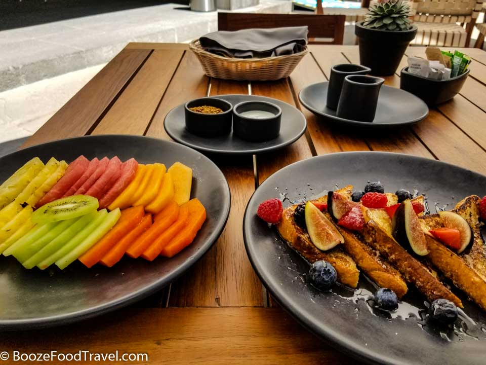 Despite feeling significantly better on my last day, I decided not to tempt fate with the choices Sala GastronĂ³mica had to offer. I was there just in time to order from the breakfast menu and took advantage of the fruit plate with yogurt and French toast with agave syrup.