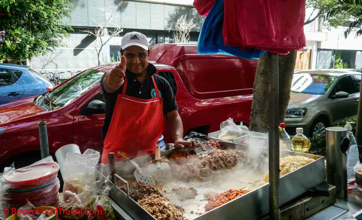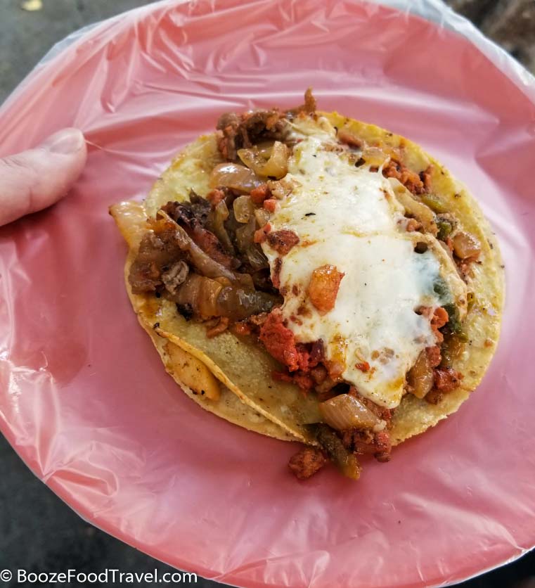 On the morning before meeting my friend for a tour around Mexico City, I wandered around the neighborhood and got a bite to eat on the street. I chose a street taco vendor that had a police officer as a customer — I figured that’s the safer bet as a vendor wouldn’t want to sicken the police. There were options — I understood the chicken, pork, and beef — and I chose the one that I didn’t recognize, which I think was chorizo with onions and who-knows-what. It was just enough to get me to brunch, particularly as my friend was running late.
