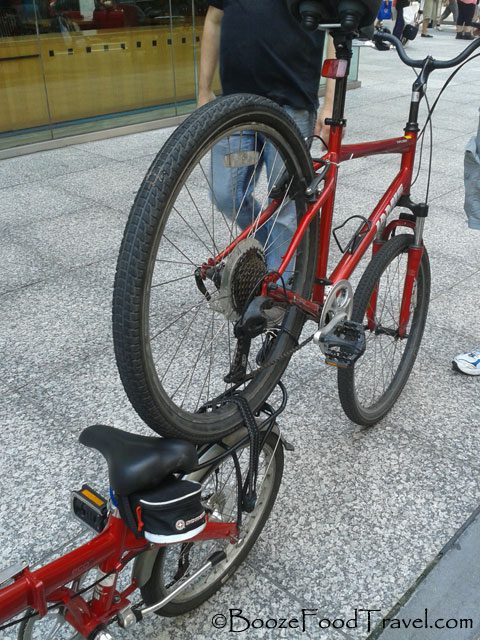 Unfortunately, because the chain was wedged behind the wheel guard, the rear wheel wouldn’t move, which made it difficult to move along the street. I figured out a way to use my rear bike rack to tow the broken bike.
