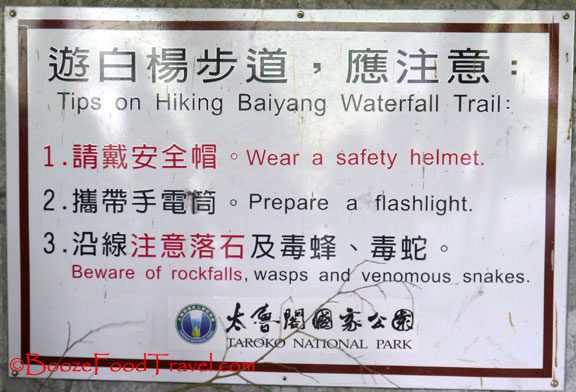 Along the road into the park, visitors are offered free helmets in case of falling rocks that appear to be rather common. Of course, for more than a small rock, the helmet will not protect you. Signs everywhere advise visitors to keep moving. If those signs weren’t ominous enough, the one before the first tunnel on the way to the Baiyang Trail and water curtain cave should be warning enough for some to not travel alone.