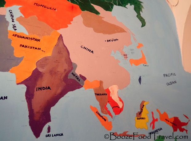 Whoever painted this map on the wall did not use much of a guide. The land masses aren’t quite what you’d expect.
