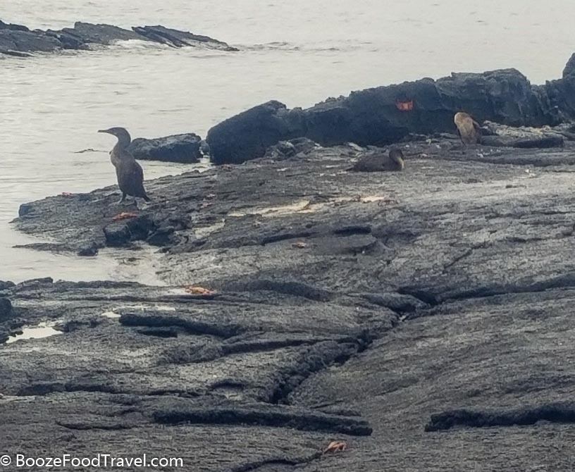 Off in the distance (my lack of a good zoom lens made it difficult to get a picture), we saw a flightless cormorant perched on the shore — usually I saw them in the water when all that’s visible is the head and neck. It’s a small bird that evolved to have smaller wings as it had no predators to fly away from, so now it’s little wings are more or less useless as it swims around the archipelago in search of fish to consume.