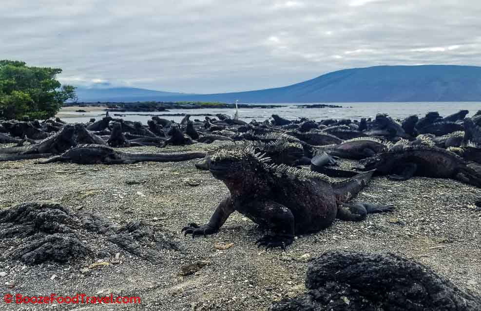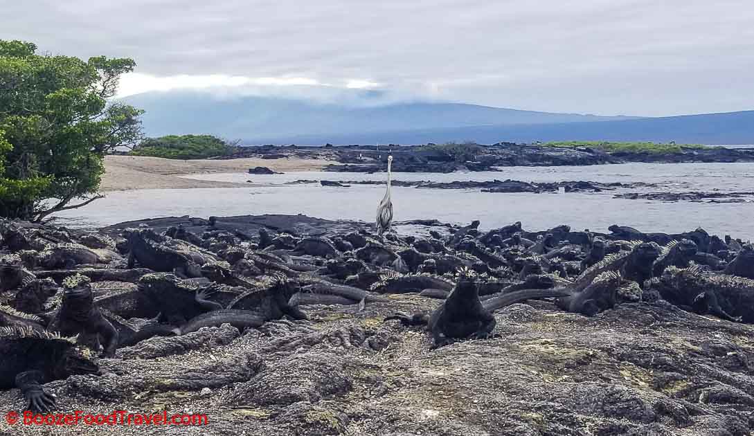When I first saw the mess of marine iguanas on Isla Fernandina, I crouched down to admire how cool they looked and take a few pictures. Then the one nearest me sneezed. It’s not really a sneeze, but seems that way — the marine iguanas expel the salt they ingest while swimming, and it come out like wet snot. It’s the only sound I heard from these creatures.As we stood at the start of our slow hike admiring the reptiles resting on the rocks, a heron in the back surveyed the mess. I wasn’t quick enough with the camera to catch it as the heron picked up a baby marine iguana for breakfast.