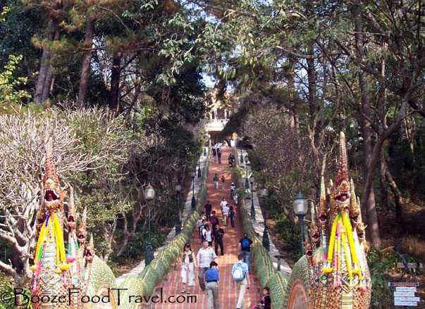 There was quite a crowd in the afternoon at Wat Phrathat Doi Suthep.  The serpents greet the visitors along the stairway up to the gate — at which point all foreigners must pay admission. After seeing so many temples in Bangkok, Ayutthaya, and Chiang Mai, most of the sights become repetitive. However, looking out into the mountains and over the city is well worth the time to enter this one.doi suthep