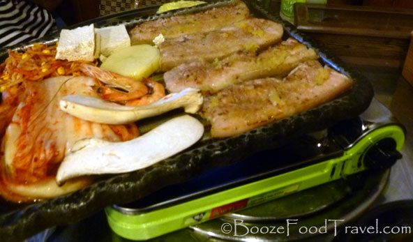 I found it a little unusual that the bacon was cut with scissors while cooking, as were some of the large pieces of kimchi. One of my friends asked if I’d ever seen scissors used during food service. I’m fairly certain I’ve only seen it used to cut masses of noodles stuck together in Vietnam. Whether or not you cut the bacon with scissors doesn’t change the wonderful taste you get to enjoy. And it goes great with beer, soju, or makgeolli.