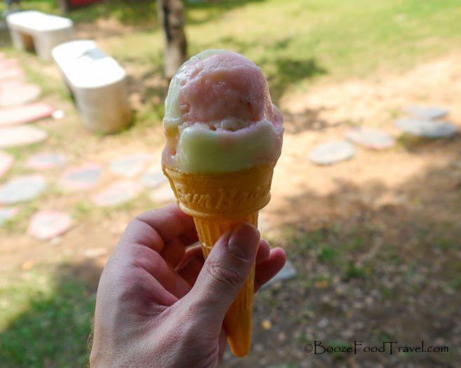 After wandering through the colorful alleys, we bought some rainbow ice cream from a roadside vendor. It was refreshing and not too sweet. It was so hot even sitting in the shade that I was tempted to buy another cone.