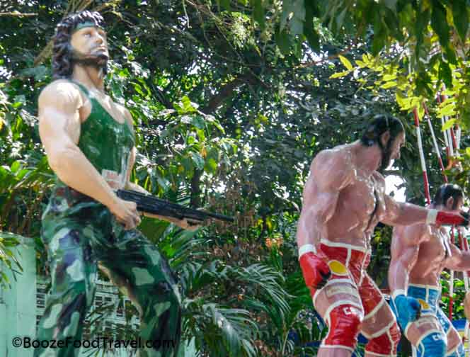 On my way out of Shwedagon, I decided to walk down the street away from the heaviest traffic before flagging down a taxi to take me back to my hotel. Along the way, I stopped off for a light lunch and the largest bottle of cold water the restaurant sold. The restaurant was open air but out of the sun near Happy World Amusement Park, which featured a statue of Rambo.